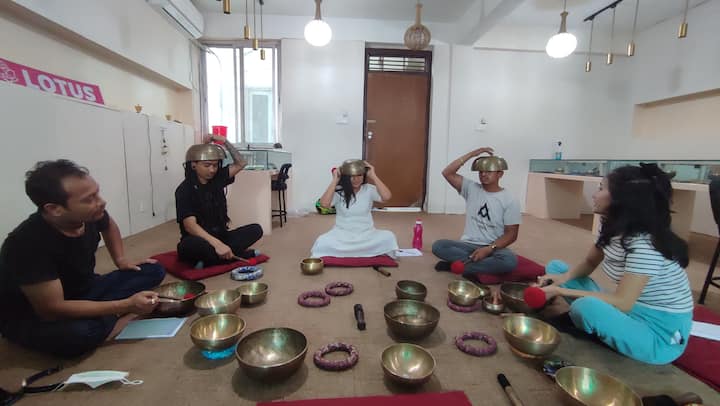 El instructor fue paciente y animó a explorar los sonidos de los diferentes tazones y explicar las diversas formas en que se pueden utilizar para la meditación.