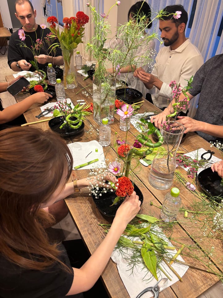 ¡Aprende el arte del Ikebana en Daikanyama! Un taller divertido y amigable para principiantes donde jugarás con flores, descubrirás la cultura japonesa y crearás tu propio arreglo.