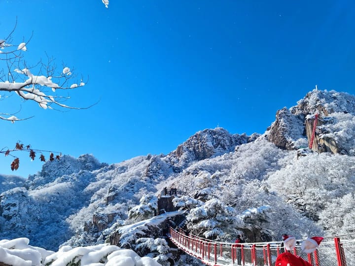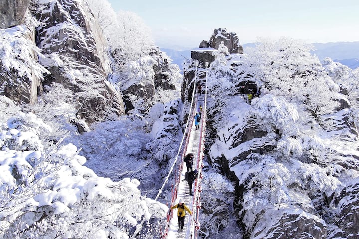 Pasea por las tranquilas callejuelas de Jeonju cubiertas de nieve y cruza un puente suspendido en un sueño invernal de montaña. Un viaje de belleza serena y alturas audaces.