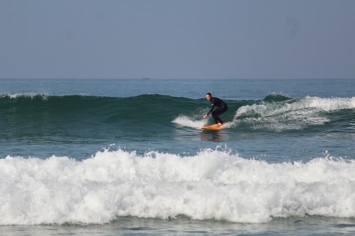 Nos reuniremos en la playa o te recogeremos, te daremos todo el equipo que necesitas para surfear, te explicaremos el lugar y la práctica de seguridad en la arena, y luego surfearás con orientación y consejos en el agua.