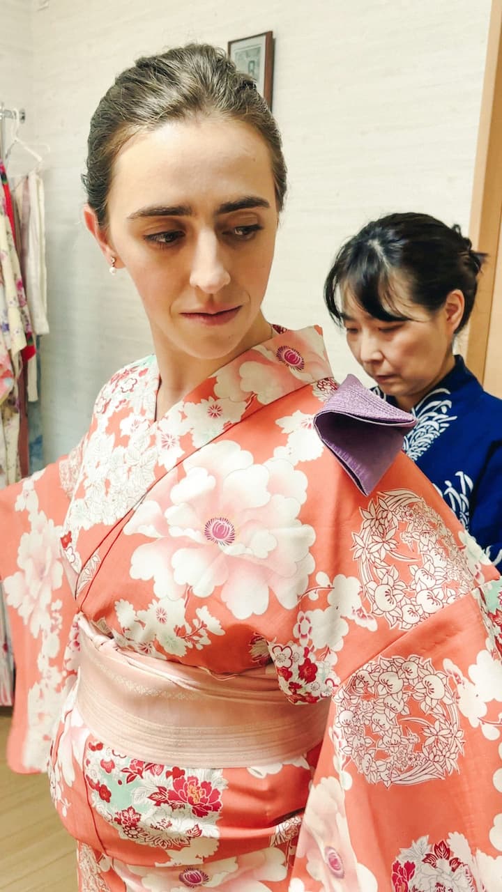 Elija su yukata favorita y experimente cómo vestirse bajo la guía de un instructor. No es necesario que traigas nada, ya que te proporcionaremos todo lo necesario. Después, aprenderemos danza japonesa con la canción «Sakura Sakura». También aprenderá los movimientos básicos de la danza japonesa y el uso del abanico.