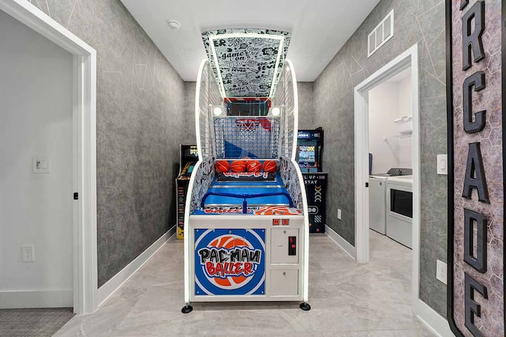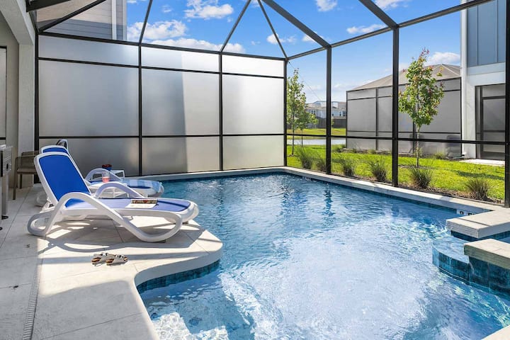 Date un chapoteo con tu pandilla y disfruta bajo el sol de Florida en tu propio refugio al aire libre instalado en una pantalla de privacidad. Sumérgete en la resplandeciente piscina, relájate en chaises o juega al futbolín en el patio. No es necesario secarse cuando llegue el momento de comer, ya que puedes cenar al aire libre bajo el lanai cubierto. ¡Tu paraíso privado te espera!