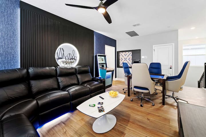 Solo espera hasta que veas los cinco fabulosos santuarios que esperan a tu equipo después de días llenos de acción en Orlando, dos en el piso principal y tres más arriba. Cada habitación cuenta con toques de diseño elegantes, camas súper cómodas, televisores de pantalla plana, lujosos baños en suite y comodidades bien pensadas. Los paneles de pared decorativos únicos dan estilo estético, mientras que los tonos relajantes (piensa en azules, verdes y tonos naturales) crean un ambiente tranquilo para una noche de descanso perfecta.