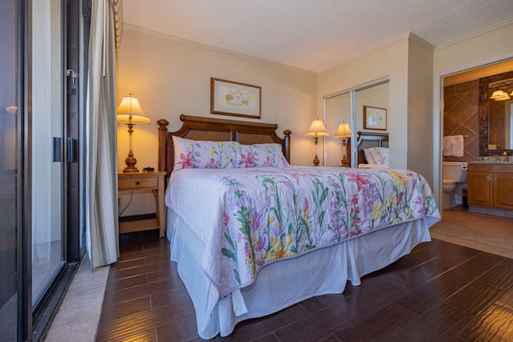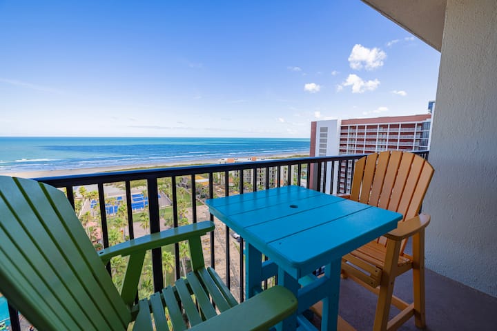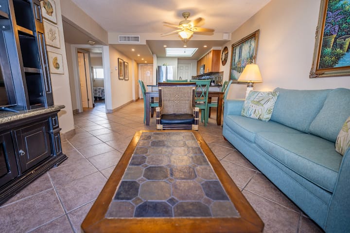 El condominio #1208 de Isla Grand Beach Resort ofrece vistas a nuestras piscinas, junto con vistas a la playa. Las habitaciones del condominio tienen capacidad para 6 personas con 1 cama tamaño king y 2 camas completas en la segunda unidad, y un sofá cama en la sala de estar.