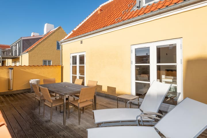 Los hermosos y bien cuidados 102 m2 se distribuyen en dos pisos. El primer piso está reservado como área para dormir. Un total de tres hermosas y luminosas habitaciones. Dos de las cuales tienen una cama de 3/4, mientras que la tercera, el dormitorio principal, tiene una cama doble (dos camas individuales colocadas juntas como una cama doble) y baño privado. Bonito espacio en el armario en todas las habitaciones y vistas increíbles de las azoteas en Gl. Skagen. Desde el rellano en el primer piso, una amplia escalera conduce directamente a la gran cocina-comedor.