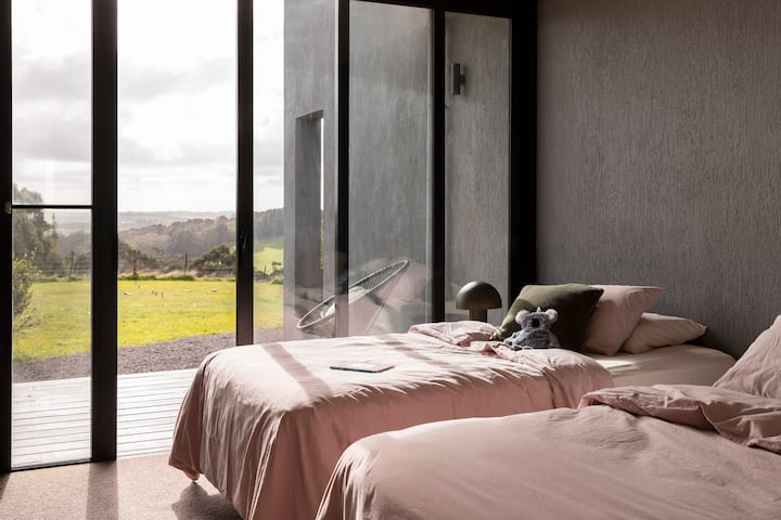 Esta casa contemporánea de diseño arquitectónico está completamente fuera de la red, utiliza un diseño solar pasivo, con techos que se elevan hacia las vistas y atraen el valle a través de ventanas del suelo al techo, creando un espacio que es tranquilo y abierto. Ubicada en la cima de una colina, la casa llena de luz ofrece impresionantes vistas de 360 grados sobre las tierras de cultivo y el bosque Otway con amaneceres y puestas de sol inmejorables.