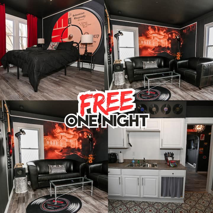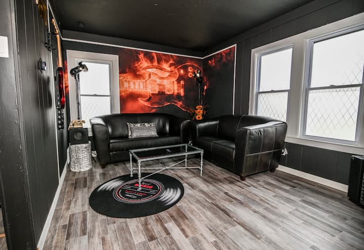 Nuestro Rock 'n' Roll Haven no es solo un lugar para alojarse; es un hogar para los entusiastas de la música. Entra en la sala de estar con temática de guitarra, donde los sonidos icónicos y la energía atemporal de las bandas legendarias se fusionan para crear una experiencia inolvidable. Ya sea que estés saliendo con amigos o relajándote después de un día de exploración, este espacio de diseño creativo prepara el escenario para una estancia inolvidable.