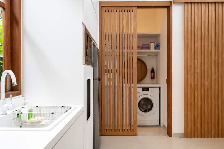 Explora las instalaciones de lavandería de Villa Asri y descubre la comodidad de una lavadora, plancha y tabla de planchar. Los servicios de limpieza diarios están disponibles para el alquiler diario y un guardia de seguridad está en el lugar para garantizar una estadía sin complicaciones, agradable y segura.