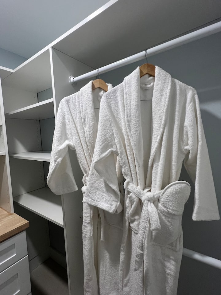 Disfruta de la comodidad del dormitorio principal, con una majestuosa cama tamaño king adornada con lujosas sábanas y almohadas mullidas. Un minibar seco, completo con una botella de vino de cortesía, añade un toque de indulgencia. El vestidor ofrece abundante espacio de almacenamiento. El baño principal adjunto es un refugio de relajación, con dos lavabos, una bañera profunda con una puerta corrediza de vidrio y todos los elementos esenciales para una experiencia similar a la de un spa.