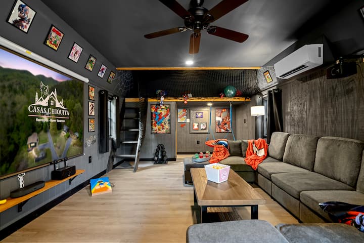Entra en la primera cabaña “Azul”, donde la elegancia contemporánea se encuentra con el encanto acogedor. La espaciosa sala de estar invita a la relajación con una chimenea eléctrica para mantenerte acogedor y lujoso mobiliario y una decoración elegante creando el entorno perfecto para pasar un tiempo de calidad con tus seres queridos. Disfruta de juegos y películas en la sala recreativa Spidey, con una gran cantidad de juegos, libros, juguetes e incluso disfraces de superhéroes para que los niños se conviertan en su superhéroe interior. Dos baños, uno con ducha de pie y otro con bañera.