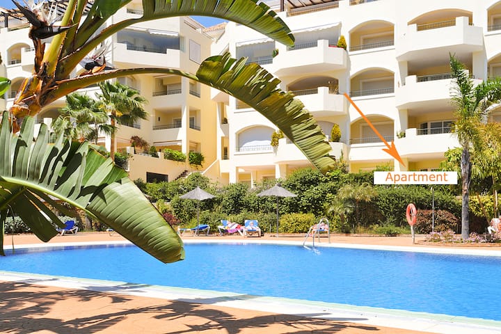 Excelente ubicación en la playa de Elviria - Marbella. Amplio apartamento de dos dormitorios con gran terraza y piscina comunitaria.