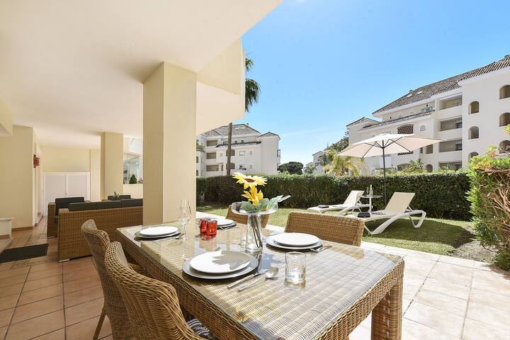 Este precioso apartamento tiene todo para pasar unas maravillosas vacaciones en la playa. El apartamento está situado en el complejo de playa Hacienda Playa en Elviria - Marbella. Hacienda Playa se encuentra directamente en la playa de arena de Elviria en la Costa del Sol. El apartamento tiene un amplio salón con un cómodo sofá y sillones, una mesa de comedor con 4 sillas y puertas correderas a la terraza. Hay 2 amplios dormitorios con cómodas camas. Ambos dormitorios tienen baños en suite y puertas correderas a la terraza. La cocina independiente está equipada con todos los electrodomésticos necesarios. Todas las habitaciones tienen aire acondicionado para la refrigeración y la calefacción. Hay conexión Wi-Fi gratuita a través de fibra óptica. El apartamento está en la planta baja y tiene una gran terraza parcialmente cubierta de 72m2, seguida de un jardín privado con dos tumbonas y mucho sol. Incluso en primavera, otoño e invierno, podrá disfrutar de muchas horas de sol en su propio jardín. Desde el jardín privado tiene acceso al jardín subtropical compartido, a la piscina y a la piscina infantil. En las terrazas alrededor de la piscina hay tumbonas de uso gratuito.