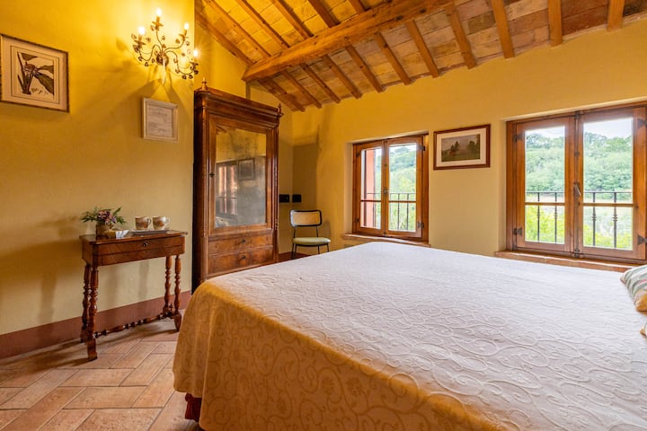 Dormitorio de una granja en una colina con vistas a un granado