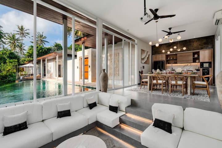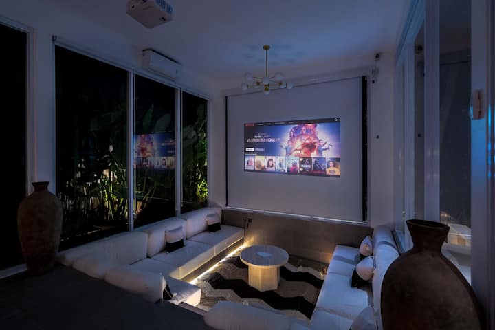 En el corazón de The Maz Villa, el salón hundido te invita a relajarte con un proyector de tamaño natural, perfecto para noches de cine acogedoras. El espacio abierto también incluye una cocina totalmente equipada y una mesa de comedor que prepara el escenario para comidas compartidas y conversaciones significativas. Dos ventiladores de techo y aire acondicionado aseguran un ambiente fresco y relajado en todas partes.