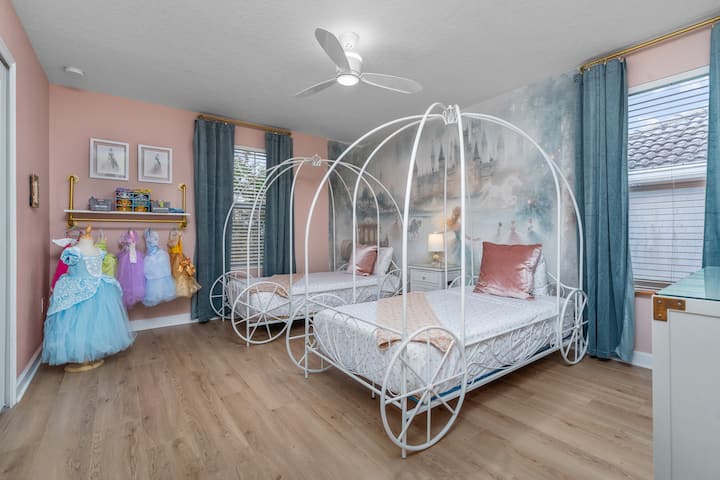 Dormitorio Princess de cuento de hadas: deleita a tu hijo con nuestra mágica habitación de princesas de cuento de hadas, con 2 camas individuales para carruajes, un tema mágico de cuento de hadas y un armario lleno de batas. Inspirados en algunas de nuestras princesas favoritas, tenemos muchos vestidos populares e incluyen zapatos, coronas y accesorios a juego. (Hacemos todo lo que esté en nuestras manos para mantener una amplia variedad de tamaños, pero no podemos garantizar que tengamos el tamaño de tu hijo).