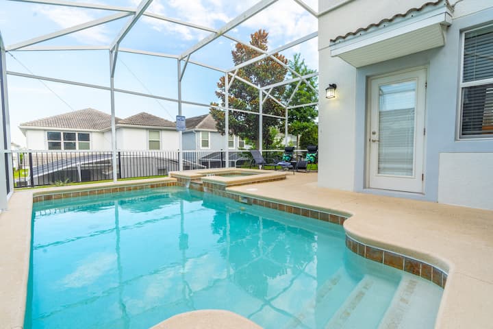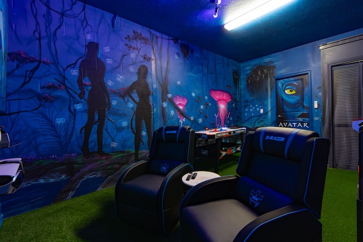 ¡Prepárate para mejorar tu experiencia vacacional en nuestra lujosa casa de 5 dormitorios y 5 baños ubicada cerca de Disney World! Esta excepcional propiedad tiene capacidad para 11 personas cómodamente, cuenta con una sala de juegos inmersiva y una sala de juegos con temática Avatar, de este mundo, habitaciones inspiradas en Star Wars, Harry Potter y Fairytale Princesses, una piscina privada y jacuzzi, así como un acogedor salón de cine en el loft. Ideal para familias y amigos que buscan una escapada lujosa, ¡esta es una oportunidad que no te puedes perder! ¡Asegura tu reservación ahora y disfruta de la mejor experiencia vacacional!