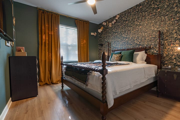 Dormitorio king inspirado en Harry Potter: mientras duermes en esta habitación inspirada en Harry Potter, es posible que sientas que te transportas a 12 Grimmauld Place. Inspirado en el famoso tapiz de la familia Black, el telón de fondo detrás de esta cama tamaño king es impresionante. Esta habitación es una de las favoritas de los huéspedes con un televisor, una decoración temática y impresiones personalizadas de algunos de tus personajes más queridos. Disfruta de todos los toques especiales en esta habitación.