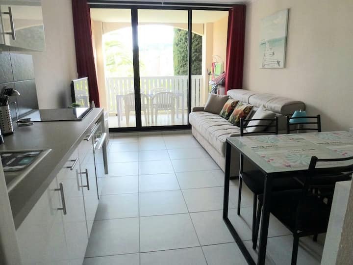 Después de varios años en alquilar en vivo, decidimos vivir la aventura de AIRBNB para nuestro estudio clasificado con 2 estrellas con la oficina de turismo situada en un entorno verde en la residencia l 'anse de Pramousquier