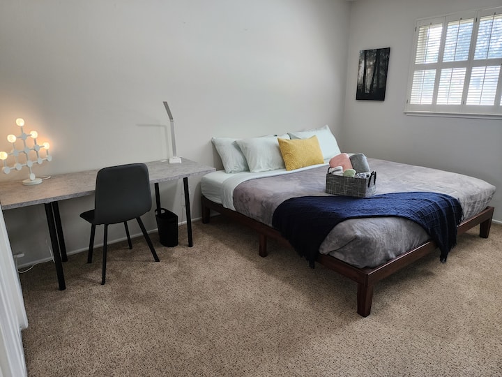 Dormitorio privado con cama tamaño king. Compartirás dos baños con hasta otros 3 ocupantes de dormitorios, generalmente solo hay una persona en cada dormitorio. Tienes el mismo acceso compartido a la cocina, sala de estar, lavandería y exquisito patio trasero.
