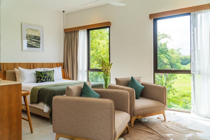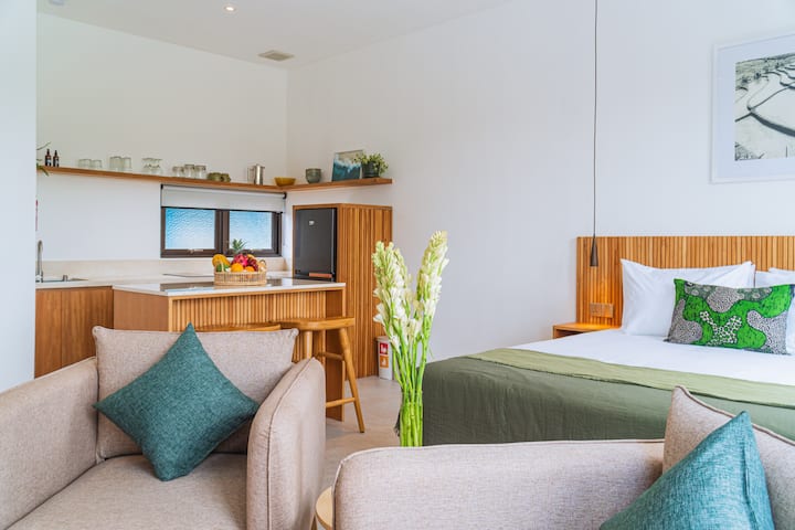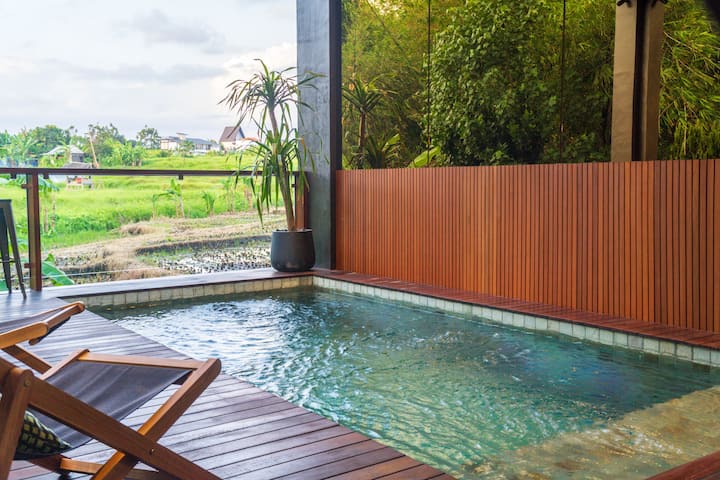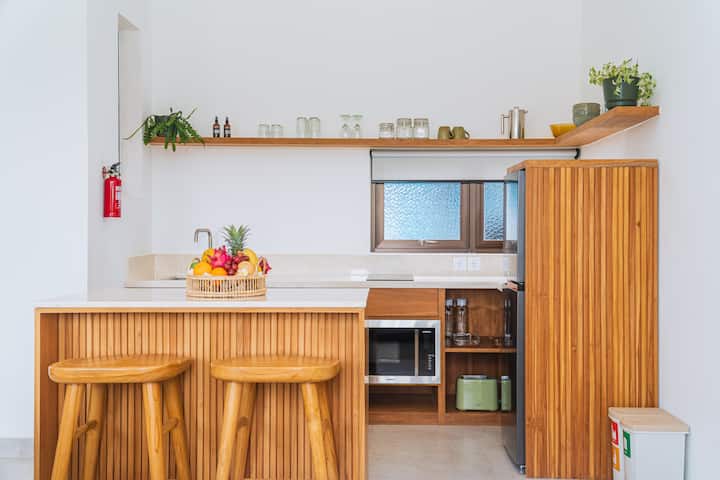 Descubre la tranquilidad de Bali con este nuevo apartamento estudio, que ofrece vistas impresionantes de los campos de arroz circundantes. Perfectamente situada a la entrada de Raya Canggu, justo al lado de Jalan Bumbak, esta residencia promete una experiencia de vida serena y tranquila en una zona residencial.