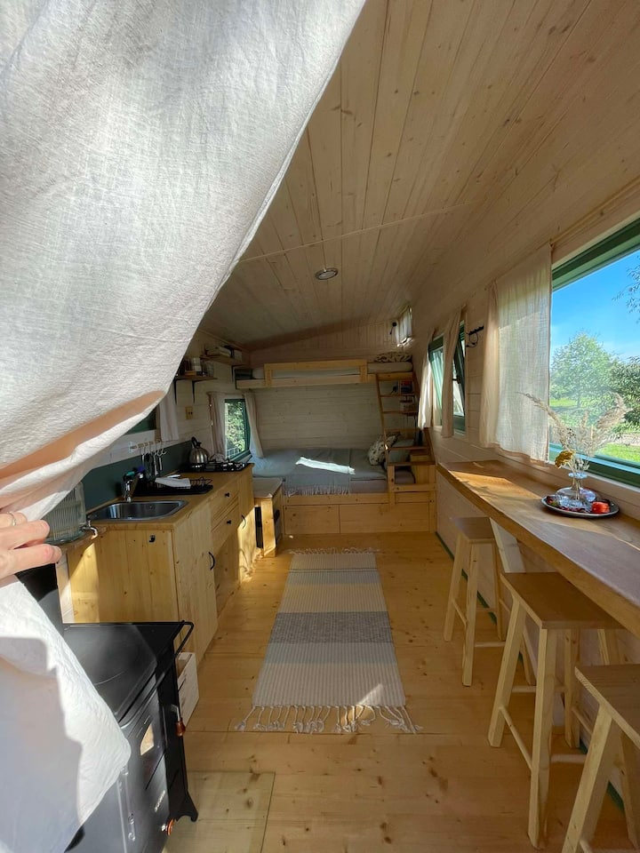 En el interior hay una cocina totalmente equipada con cocina, mininevera, platos y suministros básicos de cocina como aceite, sal, etc. También hay café y té disponibles. El agua potable y el agua para lavar platos estarán listos y se importarán en barriles. Vuelvo a llenar el agua para una estancia más larga.
