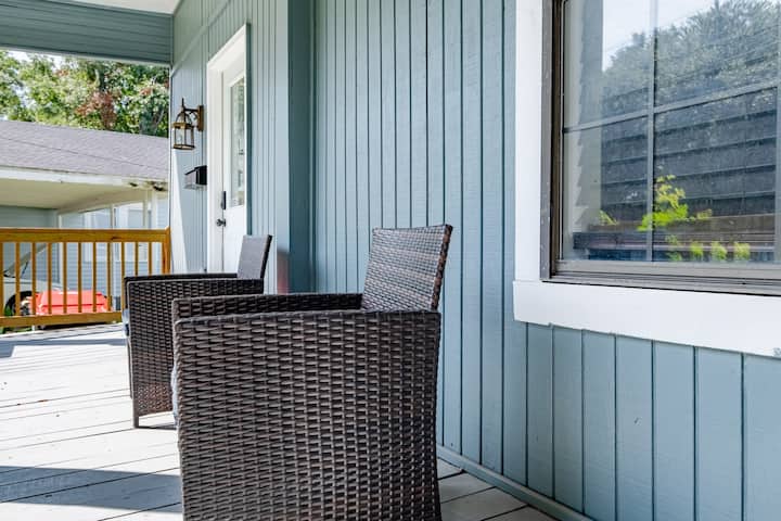 Disfruta de tu café por la mañana o bebidas por la noche en el porche delantero privado, amueblado con cómodos asientos. El patio trasero, aunque no está completamente vallado, ofrece un espacio sereno para relajarse. Hay estacionamiento gratuito disponible en las instalaciones, con opciones adicionales de estacionamiento en la calle. Las mascotas son bienvenidas, por lo que es el lugar perfecto para toda la familia.