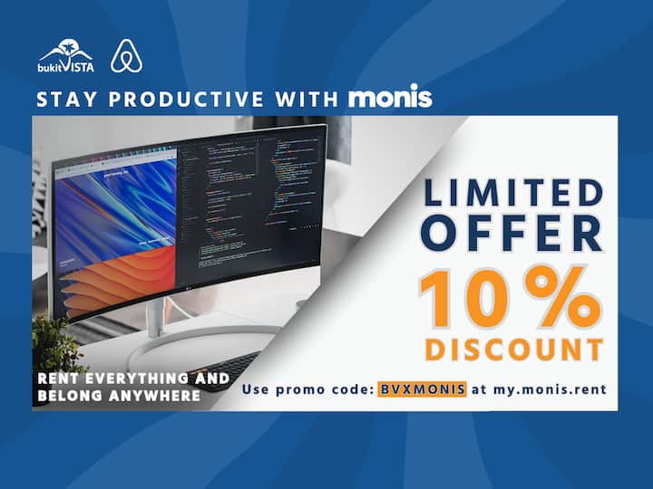 Alquila todo lo necesario para mantenerte productivo en cualquier lugar. Disfruta de un 10% de descuento en Monis con el código promocional BVXMONIS en su sitio web.