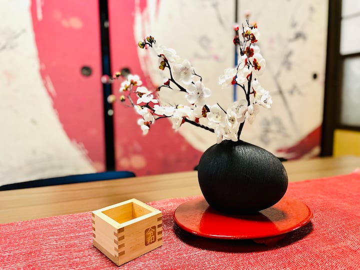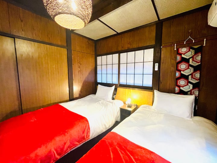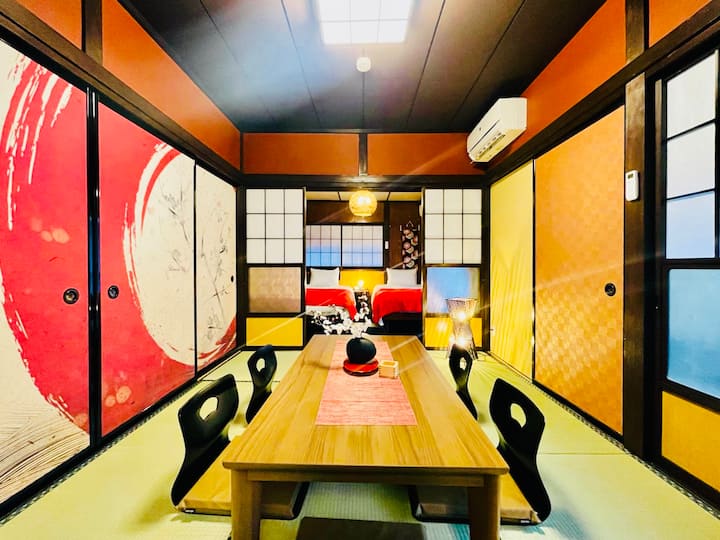 Hemos renovado una casa tradicional japonesa.Tenemos 3 habitaciones de estilo japonés, una habitación de estilo occidental y una cocina comedor.Hay 5 camas individuales y 3 futones, perfectos para familias y grupos.El "pergamino colgante" y la "buena voluntad" del joven calígrafo solo funcionan en el mundo, y también cuenta con la belleza de "fusuma" con dragones y cerezos en flor después del nombre del lugar.Espero que tengas unas buenas vacaciones rodeado de arte japonés.