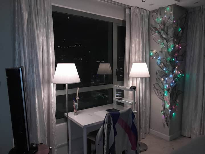 Puede alojar fácilmente a 4 personas. Buena vista. Ventanas grandes. Frente a klcc (la torre gemela más alta del mundo). Colchón tamaño king + cama individual/colchón. Inodoro compartido. Mesa (de trabajo) y armario. Mesa de discusión.