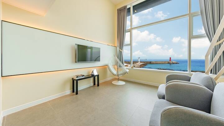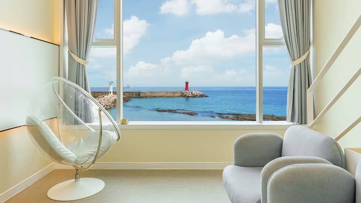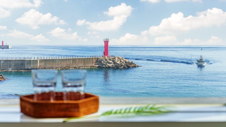 Esta es la pensión Gangneung Ninarang, donde puedes disfrutar de una vista viva al mar con tu familia.
