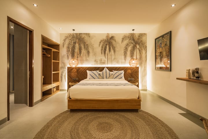 Al entrar en la planta baja, encontrarás el primer dormitorio, completo con una cama tamaño queen, aire acondicionado, un televisor inteligente y un baño privado. Esta habitación se abre a una vista a la piscina, ofreciendo un ambiente relajante desde el momento en que te despiertas.