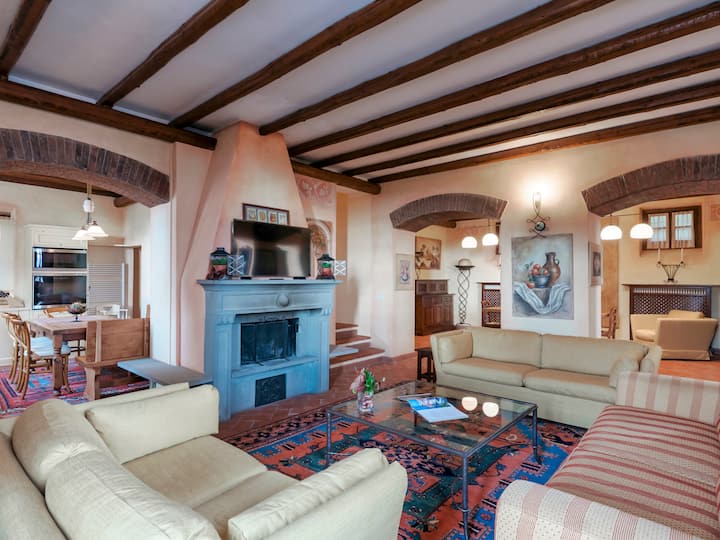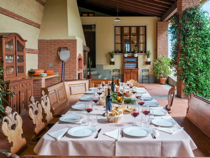 Tenuta Navelli consta de un solo edificio dividido en un cuerpo principal y un anexo (comunicándose, cuando sea necesario, a través de la puerta doble de un dormitorio doble en el primer piso). El cuerpo principal tiene tres pisos conectados por escaleras internas. PLANTA BAJA: la entrada principal en la planta baja conduce a la amplia sala de estar organizada con dos comedores, una sala de estar con sofás y chimenea ornamental, y una gran cocina integrada. La despensa, con su pasillo y el baño de invitados, que contiene el área de lavandería, completan el piso. PRIMERA PLANTA: En la primera planta hay un estudio, un amplio dormitorio doble con baño privado con ducha (con entrada doble), otro dormitorio doble con baño privado con ducha y una zona de bienestar con sauna finlandesa de infrarrojos. SEGUNDA PLANTA - En la segunda planta del ático hay una suite familiar con un dormitorio doble con camas unibles, una sala de lectura, un dormitorio (sin puerta) con cama doble y un baño con bañera. ANEXO - PLANTA BAJA - Con la entrada adyacente a la principal, consta de un salón con chimenea ornamental y cocina americana integrada, un dormitorio doble con acceso al exterior y un baño privado con ducha. ANEXO PRIMERA PLANTA: Las escaleras internas conducen a la primera planta, donde un rellano conduce a un pasillo que comunica con un dormitorio doble, un dormitorio doble con camas unibles y un baño con ducha. Aire acondicionado en todas las habitaciones (tres con unidades portátiles).