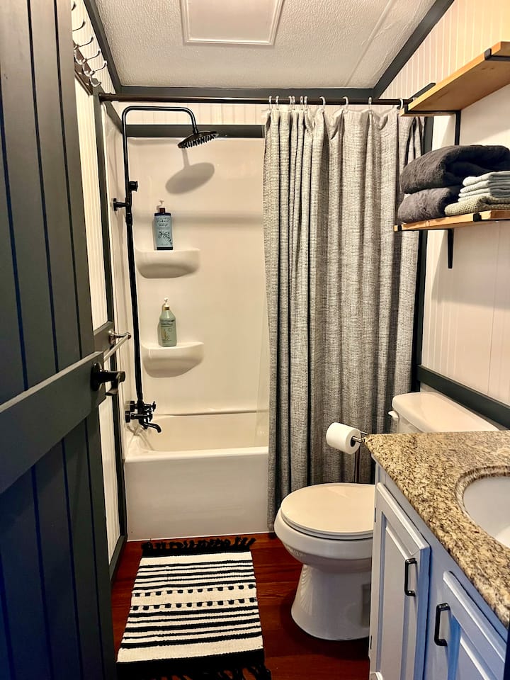 Disfruta de un refugio fuera de la red con comodidades modernas en esta acogedora casa con energía solar, escondida en las montañas de Blue Ridge. Ideal para unas vacaciones románticas, retiros de escritura, aventuras de senderismo o simplemente para disfrutar de la soledad. Mountain Top House está diseñada pensando en el tiempo de calidad. Cuenta con un espacio de estar de concepto abierto recientemente renovado para una socialización de flujo libre, un dormitorio acogedor con una vista muy agradable con vistas a un pequeño estanque y prado.