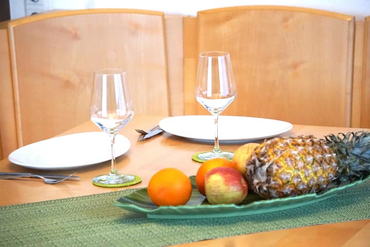 El apartamento "Aachhorn" está ubicado en el primer piso y se puede llegar a través de las escaleras o fácilmente a través del ascensor. Entras en el apartamento por el pasillo. En la tercera habitación se encuentra la sala de estar con un cómodo banco de esquina grande y mesa de comedor, así como la esquina del sofá con TV y armario. Hacia el lado del lago se encuentra el gran dormitorio doble, armario, escritorio y sillones. El segundo dormitorio está equipado con una cama doble (también ajustable individualmente), armario y cómoda y espacio para una cama adicional. En el ángulo correcto con el área del pasillo, la cocina pequeña está dispuesta con una cocina pequeña de alta calidad. Consta de un refrigerador, un congelador, placa de cerámica, horno, horno microondas, fregadero y lavavajillas. Baño de alta calidad que consta de lavabo, inodoro, cabina de ducha a ras de suelo con pared de vidrio y radiador de toallas. Desde el comedor se puede entrar directamente en el amplio balcón. En esto hay muebles de jardín de alta calidad con cojines de asiento y 2 tumbonas (más tumbonas previa solicitud). Hay una sombrilla asimétrica de alta calidad disponible para sombrear. El balcón está bordeado por una barandilla de acero inoxidable con relleno de gas de combustión de alta calidad, que protege tu ambiente privado de la vista no deseada.