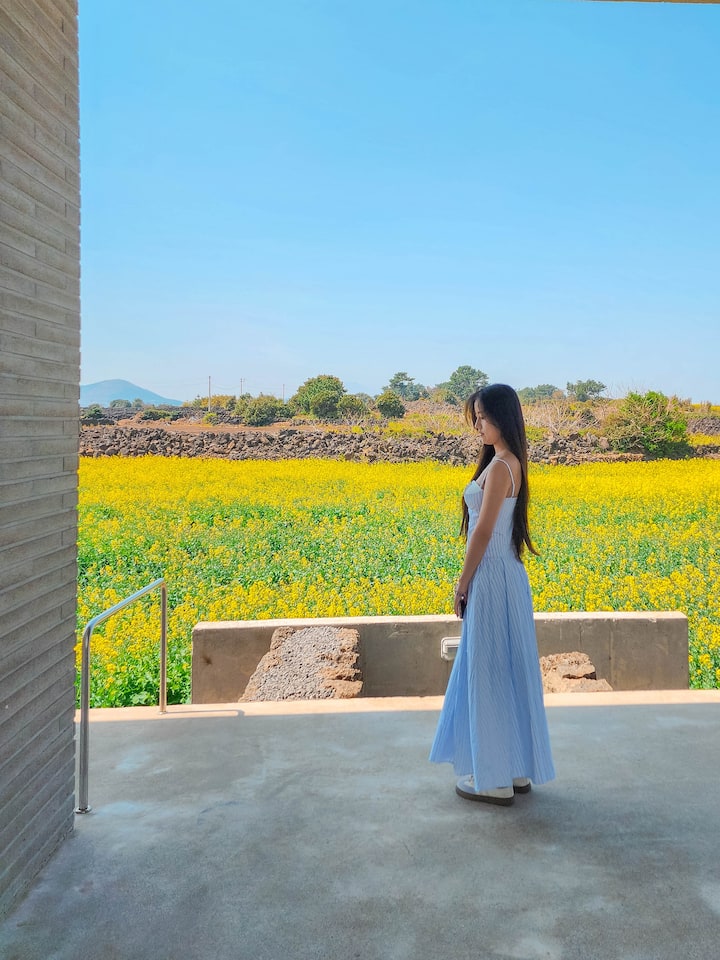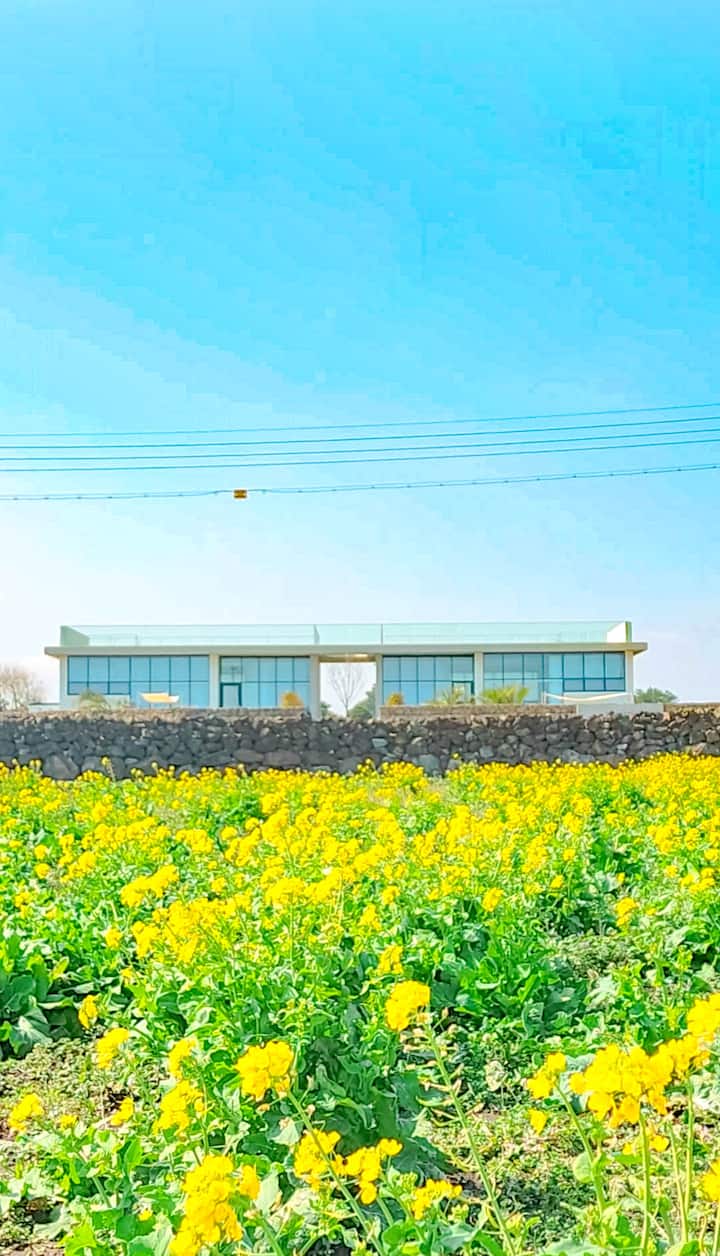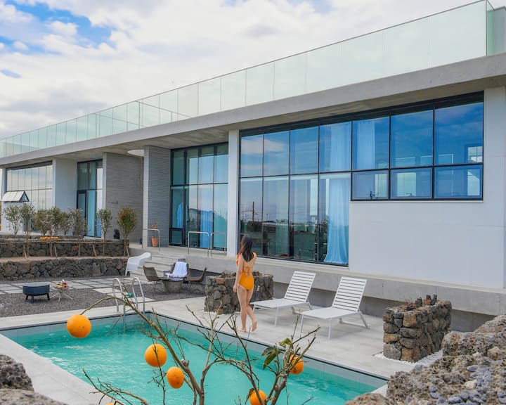 * Con una altura alta en el techo de 4 metros + 13 m de ancho, puedes ver toda la vista al mar + vistas al jardín + piscina + Hallasan + Jeju Oreum en el interior. Puedes ver tanto el atardecer como el amanecer en el interior.