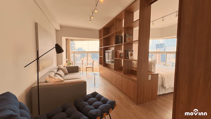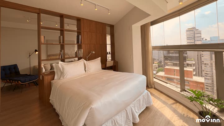 El estudio: con 49 m², el estudio está totalmente equipado para garantizar el máximo confort, con una cama tamaño queen (1,58 m X 1,98 m), sala de estar decorada y equipada, televisor inteligente, Internet de 600 mega, amenidades de Phytoervas, cocina con estufa, extractor, refrigerador, horno eléctrico, microondas, cafetera Nespresso y agua filtrada directamente del grifo (Planeta Água PURE 9), con pH entre 6 y 8, valorando la calidad y el bienestar. Además, ofrece una excelente estación de trabajo