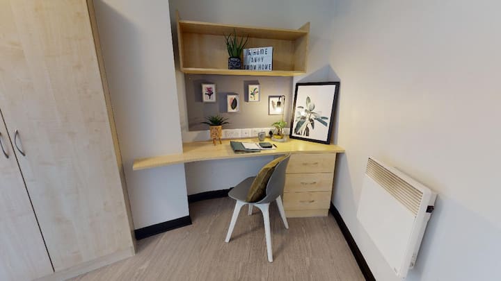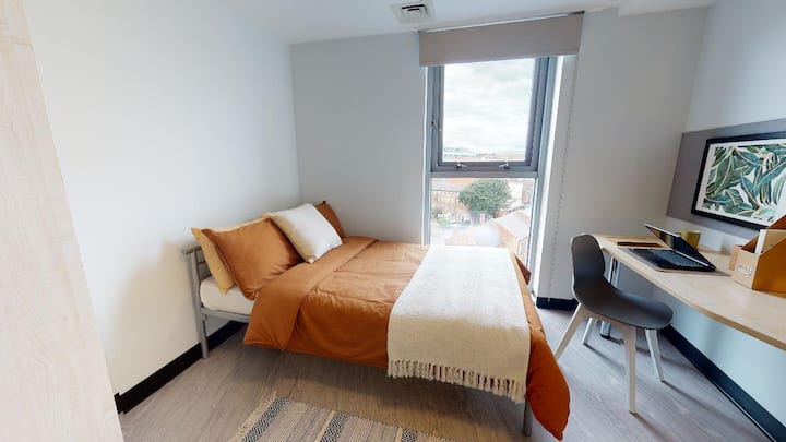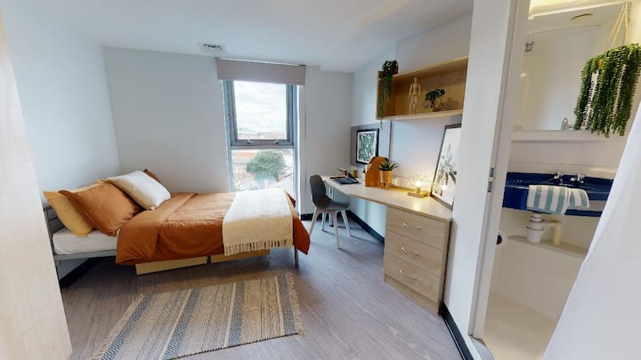✨ Disfruta de una gran relación calidad-precio en esta habitación con baño privado recientemente renovada con una pequeña cama doble, baño privado con ducha y área de estudio dedicada. Los residentes también tienen acceso a los modernos espacios de estudio y sociales del edificio, lo que proporciona una experiencia de vida cómoda y vibrante en el corazón de Nottingham.