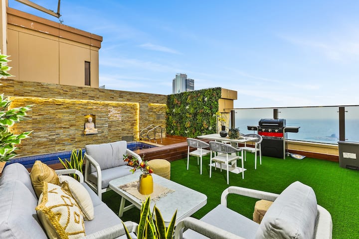 Ático de lujo de 6 dormitorios en JBR con vistas panorámicas a la marina, el mar y el horizonte. Disfruta de una piscina privada, amplios interiores y un diseño elegante. A unos pasos de The Walk JBR, Marina Walk y Skydive Dubai, este refugio es perfecto para familias o grupos que buscan aventura y relajación. Disfruta de restaurantes, tiendas y entretenimiento de primera clase, todo a pocos minutos de tu santuario privado en Dubái.