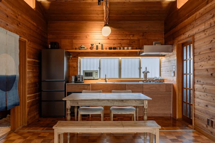 COCINA: refrigerador, arrocera, microondas, hervidor eléctrico, platos, tazas, cubiertos (palillos, tenedores, cucharas), molinillo de café, goteo, filtros, cafetera, cafetera, abrevador de vino, olla Donabe, ollas, sartén, cuchillo de cocina, pelador, rallador, condimentos (sal, pimienta, salsa de soja, aceite de arroz, aceite de oliva)