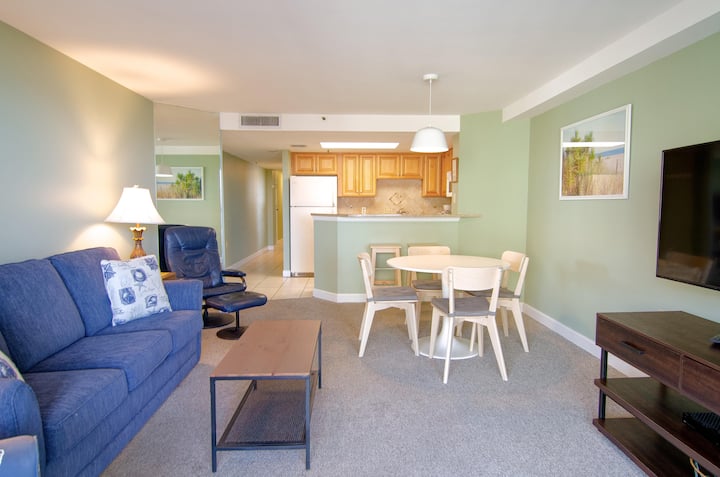 Escápate a nuestro condominio Oceanview King en Forest Dunes Resort, donde puedes relajarte y recargar energías. Comienza el día con la refrescante brisa del mar en tu balcón privado y luego disfruta de los acogedores servicios del centro vacacional, como piscinas, jacuzzi y un río lento. Este condominio es perfecto para parejas o familias pequeñas que buscan una mezcla de relajación pacífica y actividades emocionantes. Situado en la Milla de Oro de Myrtle Beach, el condominio también está convenientemente cerca de los mejores restaurantes, tiendas y locales de ocio.