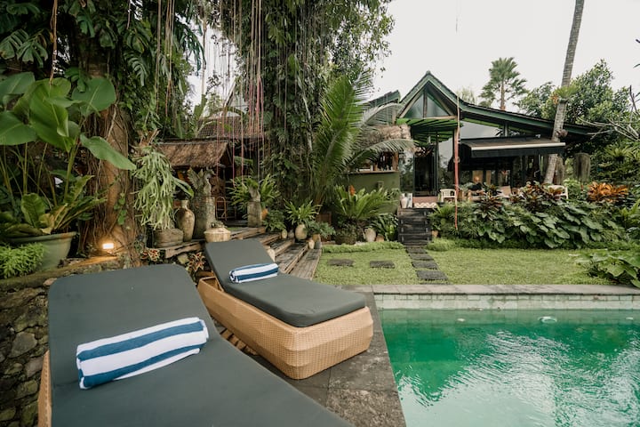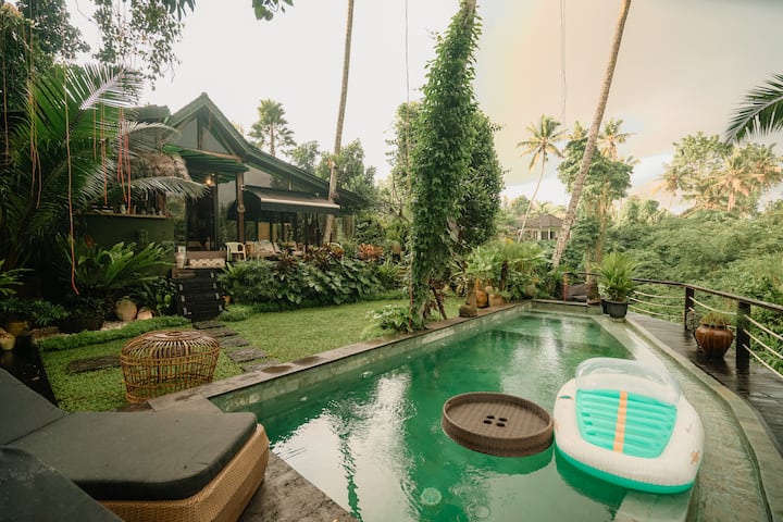 Vive lo mejor de ambos mundos: la serenidad de un exuberante entorno selvático y el fácil acceso a las atracciones emblemáticas de Ubud en una villa hogareña.