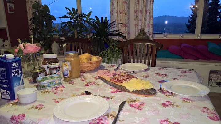 Con vista a la montaña y al jardín