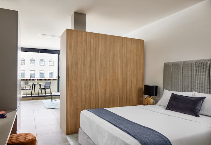 Elegante apartamento de planta abierta con un dormitorio y balcón.