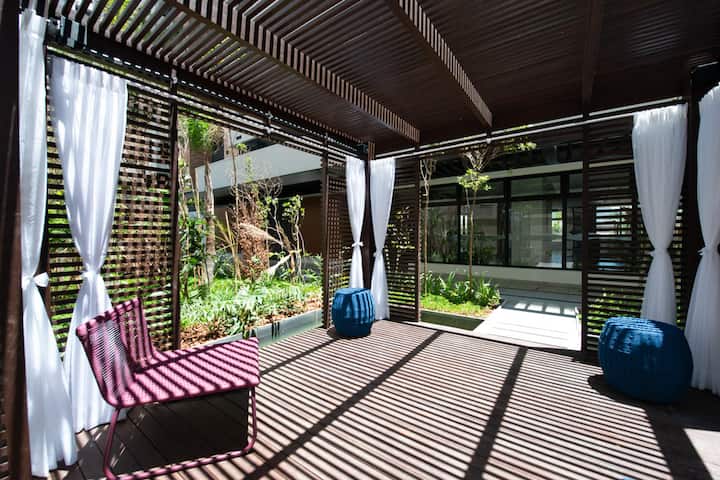 El balcón tiene una barbacoa privada con campana interior y una hamaca con vistas a la piscina.