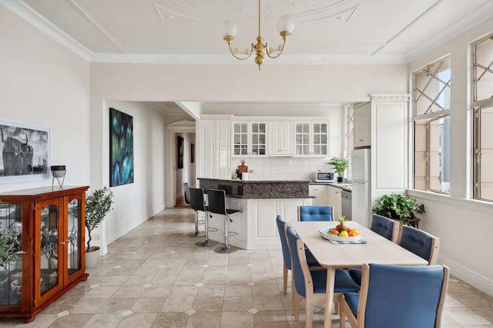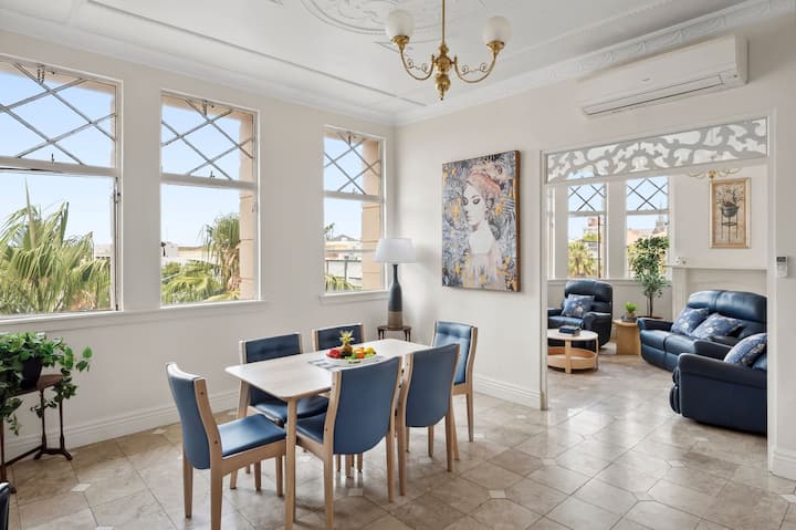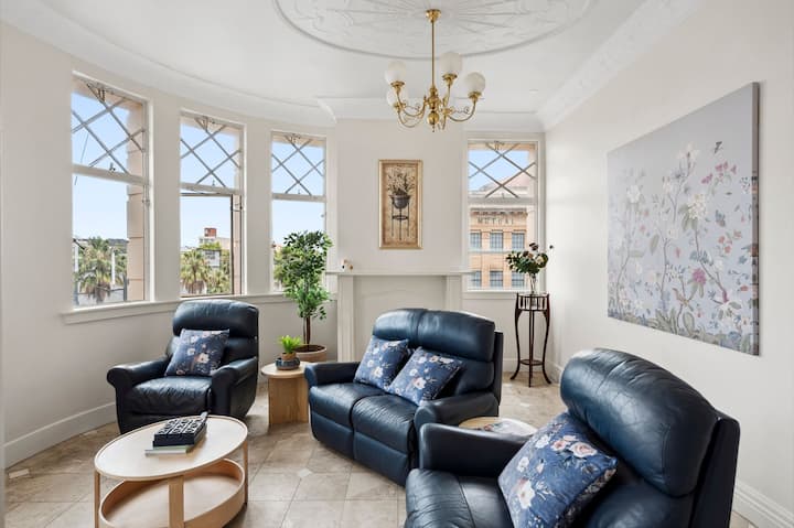 Con una ubicación céntrica en el distrito financiero de Geelong, en una impresionante construcción histórica del siglo XX con detalles del renacimiento griego. El apartamento tiene capacidad para seis huéspedes cómodamente, con tres dormitorios tamaño queen, baño principal con bañera de hidromasaje, cocina bien equipada, sala de estar detallada y estacionamiento en la calle. Situado en Malop Street, estás a solo unos pasos de los principales centros comerciales de Geelong, junto con numerosos restaurantes y opciones de entretenimiento. ¡La opción perfecta para eventos locales, vacaciones familiares y viajes de negocios!