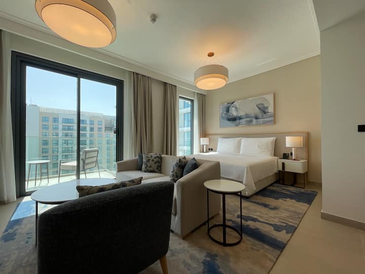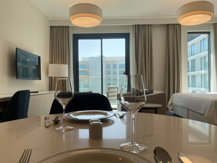 Como huésped, disfrutarás de acceso gratuito a las instalaciones privadas de la residencia, incluida la gran piscina infinita común, todo a pocos pasos de tu apartamento. También tienes fácil acceso desde la residencia al centro comercial Marassi Galleria, el destino comercial más grande de Bahréin, a solo dos minutos a pie.