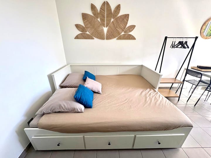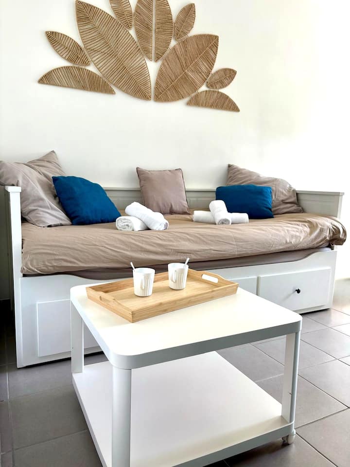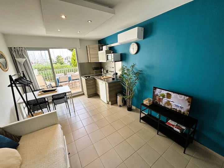 Estudio con aire acondicionado frente a los barcos y playa a 100 m