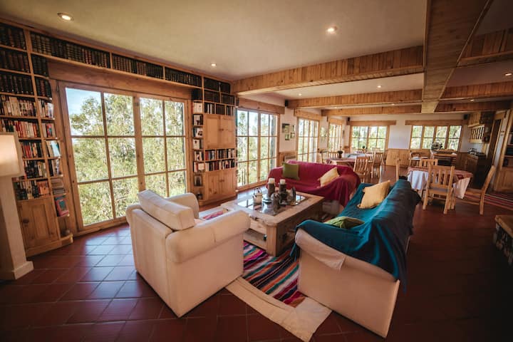 Se encuentra a disposición de nuestros huéspedes la casa entera con la planta baja que es la planta principal de la casa que consiste en un espacioso living y comedor, con bar y chimenea, y una amplia cocina. En la misma planta se encuentra el espacio del mirador con sillones cómodos y una mesa para una cena romántica viendo las luces de la ciudad en la noche, y se encuentra el área del SPA con la cabina del sauna seco finlandés (uso con costo adicional) y una área de descanso, duchas y baño. Saliendo de la casa hacia el jardín, contamos con una terraza semi-abierta con cubierta con sillones tipo lounge, y avanzando hacia el jardín se encuentra una amplia terraza con un área para fogatas. En la planta alta tenemos las 5 habitaciones cada una con su baño privado. (Según el número de huéspedes se pone a disposición solo la cantidad de habitaciones reservada.)