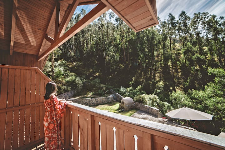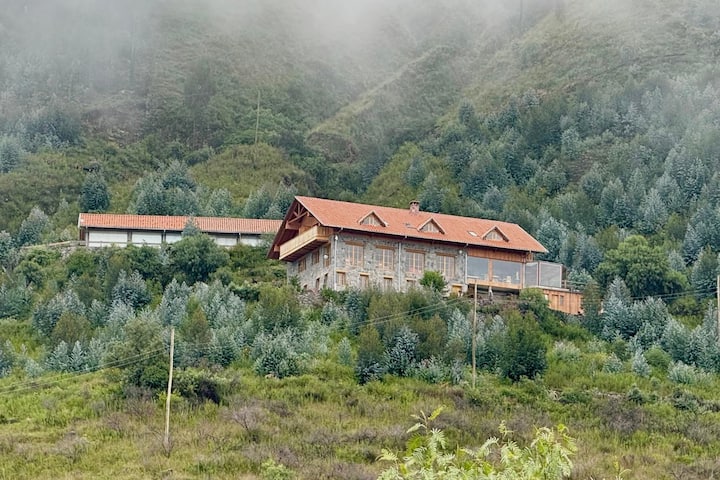 Nuestra lujosa casa de montaña al estilo de los Alpes europeos, se encuentra en una propiedad privada con mas de 30 hectáreas de bosques reforestados, al pie del majestuoso Pico Tunari, y cuenta con una vista panorámica al Valle de Cochabamba. Invitamos a vivir un escape relajante, romántico, y/o activo. Descansar en las amplias y cómodas habitaciones con balcón. Relajarse en el espacioso living con chimenea. Disfrutar de la terraza rodeada de naturaleza. O relajarse en el sauna seco finlandés.