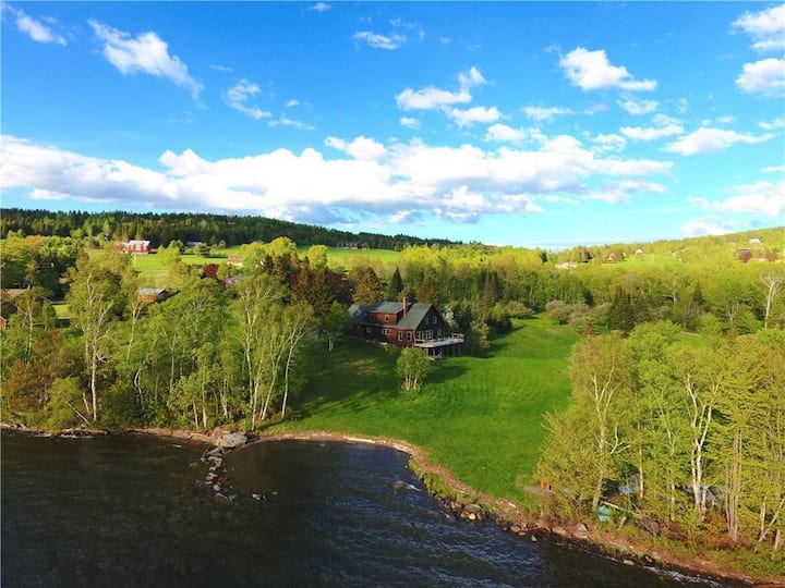- El comedor tiene una mesa DR con capacidad para 6 personas, y el salón contiguo tiene una chimenea de piedra y hermosas vistas al lago Rangeley.